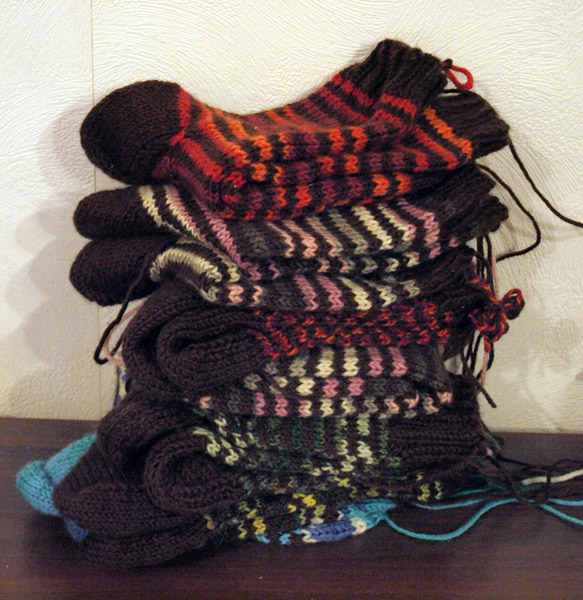 Ei irtoa nyt sanoja. Elossa ollaan ja neulotaan. Tässä viime vuoden viimeiset valmistuneet ja joululahjat. Raitasukkia oon kai tehnyt 11 paria, tässä kuvassa ei siis kaikki. Vielä on kahdet tulossa. Lankana niissä on yksivärinen seiskaveikka (ruskea) ja sitten raitoina jotakin Raitaa, Polkkaa tai Tweediä. Ehkä saan näistä vielä joskus jonkun in action -kuvan! Cascade 220:sta tehdyt Capucine ja tavalliset lapaset menivät kaverille. Tuubihuivit on Novitan ohjeella tehdyt, molempiin riitti 200g lankaa ohjeen 300g sijaan. Pöllölapaset on Pallaksesta kaksinkertaisena ja hieman liian pienet. Ne tulevat minulle korjaukseen vielä. Palmikkolapaset jostain ohjeesta sovellettu, seiskaveikkaa ovat nekin. Tarkempia tietoja löytyy Ravelrysta ja saa myös kysyä!